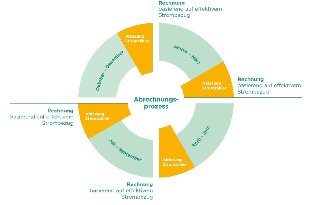 Durch die Einführung der Sommer- und Winterpreise werden die Stromzähler vierteljährlich abgelesen und nach effektivem Verbrauch in Rechnung gestellt.