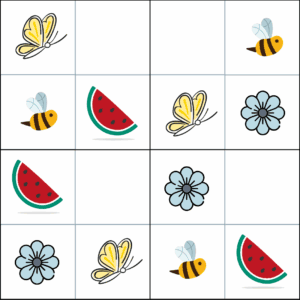 Ewolina braucht deine Hilfe bei einem schwierigen Bildersudoku. In jedem Kästchen, jeder Reihe und jeder Zeile soll jedes Bild genau einmal vor-kommen. Kannst du ihr dabei helfen?