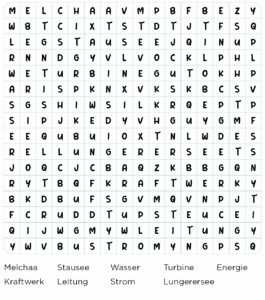 Hilf Ewolina, alle neun Wörter, welche zu Strom und Wasser gehören, zu finden